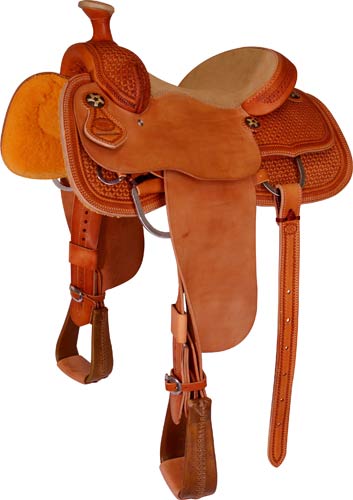 Each saddle is made from a combination of Wickett & Craig and Hermann Oak extra-heavy skirting leather, stainless steel hardware and 100% golden sheepskin. Each saddle has a 3-1/2? cantle, and a 7-1/2? tall and 13? wide swell. The 3/4 breed saddle features the popular diamond waffle stamp with a double weave border tooling pattern, buffed seat jockey and fenders, and a full, hand-stitched suede seat. The fully stamped saddle features the same diamond-waffle stamp and has a unique tri-weave border stamp. An inlaid, suede, bicycle-shaped seat really sets this saddle apart. All saddles come with latigo tie straps and the NRS contoured 6? flank cinch. Antique engraved German silver conchos. e.