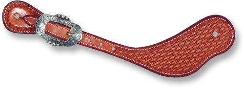 Cowboy Spur Strap, basket stamped, latigo lined, and sewn edges with Flower Bubble buckle. Available in Large and Medium.
