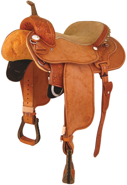 NRS, Courts and Sharon Camarillo, have joined up and created the "Sharon Camarillo Elite," exclusive to NRS and built on Sharon's New "Performance Lite" tree. This is probably the "cutest" barrel racer Courts has ever built and features a unique combination of border, basket and oak leaf hand-tooling, a sewn-down back housing and natural rawhide laced horn, cantle and stirrups. The best feature of this saddle, besides it's looks, is the unique dropped front rig enables you to cinch the saddle evenly down the horse's back and keeps the saddle from tilting forward. The low rig keeps the latigo from bulging under your knee.