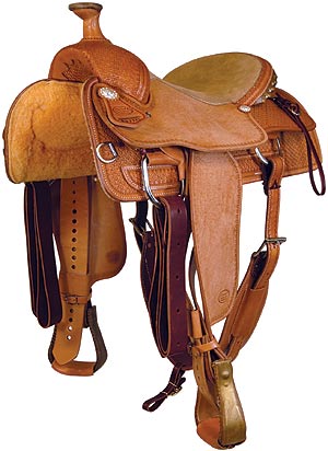 The first team roping saddle designed specifically to fit a woman. Just as rugged and durable as any other team roper but not as heavy or awkward for women to handle. The ground seat in this saddle makes the swells narrower and more comfortable for smaler framed ladies. The tree in this saddle is wide enough to fit working stock horses while keeping the seat suitable for women. This saddle is a medium oil half-breed style with hand-tooled spider pattern and shell border. It has roughout fenders and front seat jockey with a tan suede seat and Montana Silversmith berry conchos.